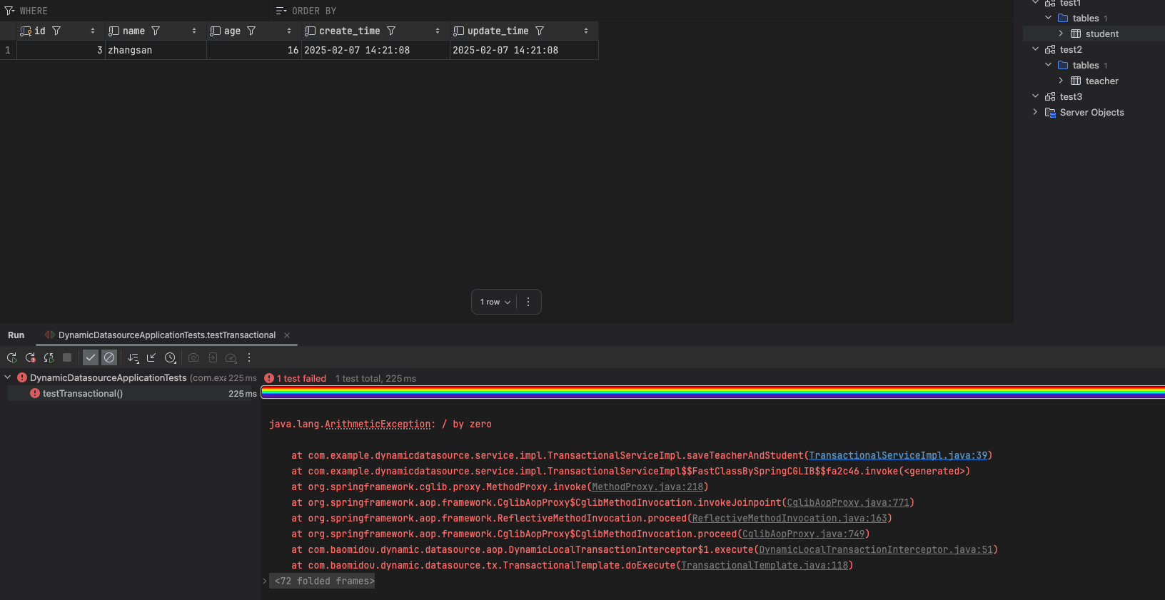 开启一个事务,在同一个事务内保存teacher和student,中间模拟了一个异常,看事务是否能够正常回滚